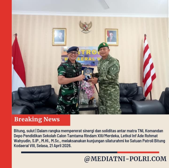 POLSUSWASKIANA – BITUNG. Rabu, 22 April 2026. Dalam rangka mempererat sinergi dan soliditas didalam tubuh matra TNI antara Matra AD Matra AL Matra AU, Komandan Depo Pendidikan Sekolah Calon Tamtama Rindam XIII/Merdeka, Letkol Inf Ade Rohmat Wahyudin, S.IP., M.HI., M.Sc., melaksanakan kunjungan silaturahmi ke Satuan Patroli Bitung Kodaeral VIII, Selasa, 21 April 2026.