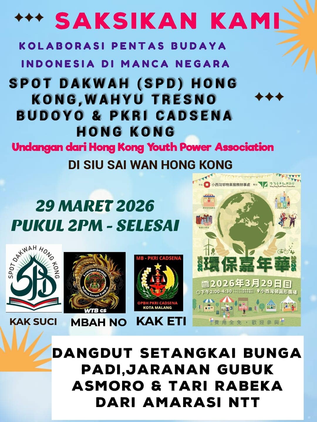 Kolaborasi pentas budaya Indonesia di manca negara Hongkong, dijadwalkan pada tanggal 29 Maret 2026. Adapun peserta dari beberapa organisasi pilihan nanti akan menerima sertifikat dari pemerintah HK.