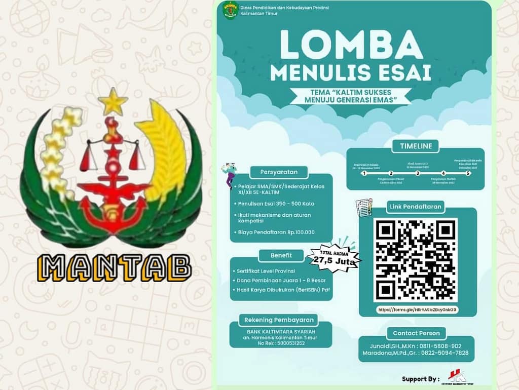 PKRI INFO SAMARINDA – Dinas Pendidikan dan Kebudayaan (Disdikbud) Provinsi Kalimantan Timur secara resmi membuka pendaftaran Kompetisi Menulis Esai Tingkat Provinsi Kaltim bagi pelajar SMA/SMK/sederajat. Kompetisi ini menjadi aksi nyata pemerintah daerah dalam menerjemahkan visi Gubernur Kaltim, H. Rudy Mas’ud, yaitu “Kaltim Sukses Menuju Generasi Emas,” dengan fokus pada pengembangan SDM yang cerdas, produktif, dan berdaya saing global. Pendaftaran kompetisi dibuka mulai 5 hingga 19 November 2025, dengan target ambisius mencapai 1.200 peserta dari seluruh penjuru Kaltim.